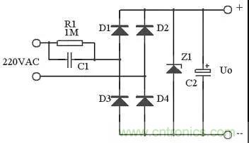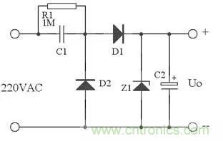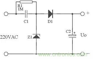 在實際應(yīng)用中,可以用下圖代替上圖,這里用了Z1正向特性和反向特性,其反向特性(也就是其穩(wěn)壓特性)來穩(wěn)定電壓,其正向特性用來在市電負(fù)半周給C1提供放電回路。