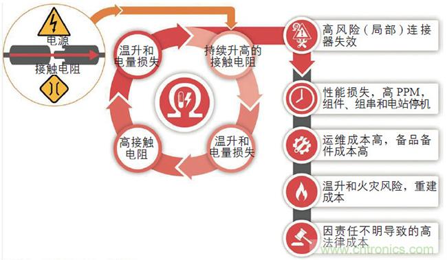 電站的盈利能力與選擇高質(zhì)量的部件息息相關(guān)。業(yè)主在光伏連接器上節(jié)省資金,并不是一種明智的做法。因?yàn)?,不注重質(zhì)量,通常意味著后續(xù)的高損失和風(fēng)險(xiǎn),而這些本可避免。光伏連接器的低接觸電阻及長期可靠性,能夠保障電站高效和安全運(yùn)行。而持續(xù)升高的接觸電阻會導(dǎo)致光伏項(xiàng)目的安全風(fēng)險(xiǎn)大幅提高,降低電站運(yùn)行效率。需要指出的是,各種不同的風(fēng)險(xiǎn)因素是密切相關(guān)的,如圖1 所示。