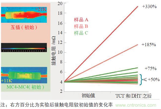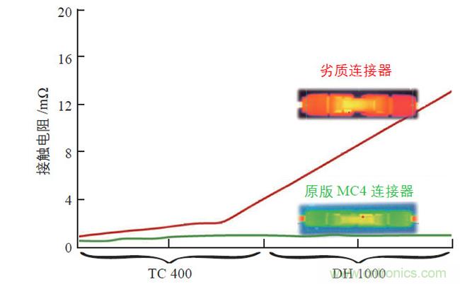 從光伏連接器的外觀和質(zhì)感可大致了解該產(chǎn)品的外形設(shè)計(jì)及絕緣材料的選擇。但是,評價(jià)光伏連接器好壞的核心指標(biāo)是公母連接器對插之后的接觸電阻。一個高質(zhì)量的連接器須具有很低的接觸電阻,并能夠長期維持這種低接觸電阻狀態(tài)。根據(jù)光伏連接器最新國際標(biāo)準(zhǔn)IEC 62852,公母對插后的接觸電阻在TC200+DH1000 測試后,增量不能大于5 mΩ或者電阻終值小于初始值的150%。而這僅是最低要求,不同廠商連接器的接觸電阻值取決于制造商的技術(shù)水平。對于如何評判接觸電阻,TC400(2×TC200)和DH1000 實(shí)驗(yàn)提供了一個解讀方向。圖2 為實(shí)驗(yàn)比較后的結(jié)果,由圖2 可知,高質(zhì)量的光伏連接器的接觸電阻非常穩(wěn)定,這主要得益于其所使用的電連接技術(shù)。因此,客戶在選擇光伏連接器時(shí),須對其所使用的核心技術(shù)進(jìn)行全面的了解。