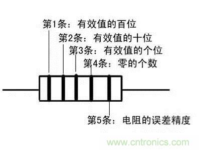 電阻器上用不同顏色的環(huán)來(lái)表示電阻的標(biāo)稱阻值,常見的電阻器有四色環(huán)電阻和五色環(huán)電阻。四色環(huán)電阻,一般是碳膜電阻,用三個(gè)色環(huán)來(lái)表示阻值,用一個(gè)色環(huán)表示誤差。五環(huán)電阻一般是金屬膜電阻,精度更高,常用四個(gè)色環(huán)表示阻值,另一個(gè)色環(huán)表示誤差。