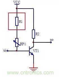 電阻R1用來(lái)限制電路中電流,防止可變電阻器阻值調(diào)到最小時(shí),使得三極管VT1基極電壓等于電源電壓VCC,那樣會(huì)因?yàn)閂T1基極電流太大而損壞VT1,這種電阻在電路中一般稱為保護(hù)電阻。
