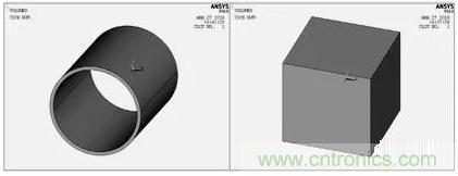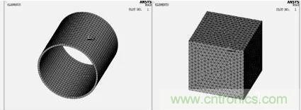 網(wǎng)格劃分對有限元的求解及其重要,單元越小,網(wǎng)格越細,則離散域的近似度越好,計算結果也越精確,但計算量及誤差都將增大。本文建立的線圈模型是一個規(guī)則的柱體,采用體掃掠方式劃分網(wǎng)格??諝饽P徒?jīng)過澆筑之后形狀變得復雜,采用自由方式劃分網(wǎng)格。圖2為線圈和空氣的有限元模型,最后通過numcmp命令將其澆筑在一起。