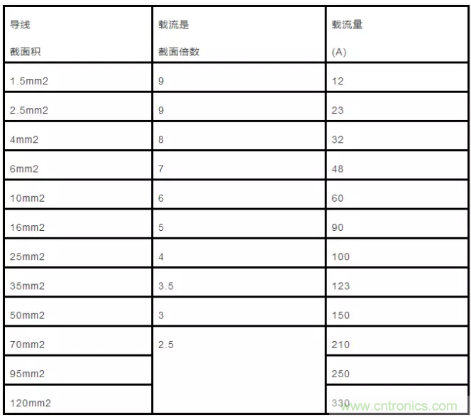 2.5mm’及以下的各種截面鋁芯絕緣線,其載流量約為截面數(shù)的9倍。如2.5mm’導(dǎo)線,載流量為2.5×9=22.5(A)。從4mm’及以上導(dǎo)線的載流量和截面數(shù)的倍數(shù)關(guān)系是順著線號往上排,倍數(shù)逐次減l,即4×8、6×7、10×6、16×5、25×4。