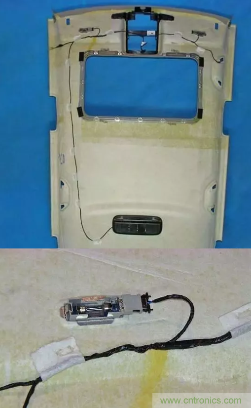 高爾夫的頂棚線束包扎設(shè)計(jì)方案為膠帶黏粘到頂棚上進(jìn)行固定,如下圖所示。