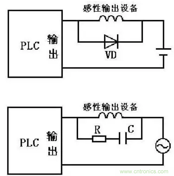 PLC的輸出端經(jīng)常連接的是感性輸出設(shè)備(感性負(fù)載),為了抑制感性電路斷開時(shí)產(chǎn)生的電壓使PLC內(nèi)部輸出元件造成損壞。因此當(dāng)PLC與感性輸出設(shè)備連接時(shí),如果是直流感性負(fù)載,應(yīng)在其兩端并聯(lián)續(xù)流二極管;如果是交流感性負(fù)載,應(yīng)在其兩端并聯(lián)阻容吸收電路。如圖6-10所示。