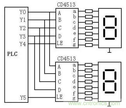 如果PLC使用繼電器輸出模塊,應(yīng)在與CD4513相連的PLC各輸出端接一下拉電阻,以避免在輸出繼電器的觸點(diǎn)斷開時(shí)CD4513的輸入端懸空。PLC輸出繼電器的狀態(tài)變化時(shí),其觸點(diǎn)可能抖動(dòng),因此應(yīng)先送數(shù)據(jù)輸出信號(hào),待該信號(hào)穩(wěn)定后,再用LE信號(hào)的上升沿將數(shù)據(jù)鎖存進(jìn)CD4513。