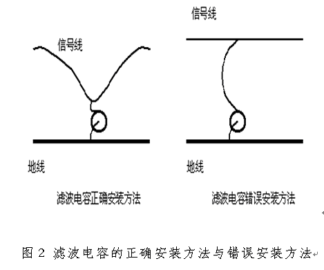 電容的諧振頻率由ESL和C共同決定,電容值或電感值越大,則諧振頻率越低,也就是電容的高頻濾波效果越差。ESL除了與電容器的種類有關(guān)外,電容的引線長度是一個十分重要的參數(shù),引線越長,則電感越大,電容的諧振頻率越低。因此在實際工程中,要使電容器的引線盡量短,電容器的正確安裝方法和不正確安裝方法如圖2所示。