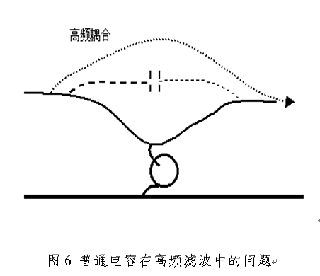 在實際工程中,要濾除的電磁噪聲頻率往往高達(dá)數(shù)百M(fèi)Hz,甚至超過1GHz。對這樣高頻的電磁噪聲必須使用穿心電容才能有效地濾除。普通電容之所以不能有效地濾除高頻噪聲,是因為兩個原因,一個原因是電容引線電感造成電容諧振,對高頻信號呈現(xiàn)較大的阻抗,削弱了對高頻信號的旁路作用;另一個原因是導(dǎo)線之間的寄生電容使高頻信號發(fā)生耦合,降低了濾波效果,如圖5所示。