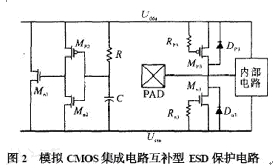 數(shù)字電路一般采用兩級(jí)保護(hù)電路,并且在主保護(hù)電路和次保護(hù)電路中串聯(lián)一個(gè)限流電阻,而大的限流電阻和ESD 鉗位器件的節(jié)電容會(huì)產(chǎn)生一個(gè)大的RC 延遲,因此,不適合應(yīng)用于高速模擬CMOS集成電路中。