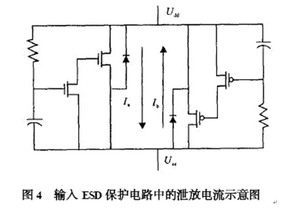 該保護(hù)電路在NS 模式下通過M9 釋放ESD 電流,在PD 模式下通過M8 釋放,均能達(dá)到較高的耐壓值(見表1) 。 當(dāng)放電模式是PS 模式時(shí),利用電源間的保護(hù)電路來形成一條新的放電路徑,電流通過ggPMOS(M8 ) 正向偏置的寄生二極管流向Udd ,Udd和GND 之間的電壓升高,M6 和M3 構(gòu)成的RC 檢測(cè)電路,觸發(fā)大尺寸的MOS 管(M2 , M0 ) 迅速導(dǎo)通,在Udd 和GND 之間形成通路, 有效放電。 由于ggPMOS 的寄生二極管處于正向偏置,Udd 和GND之間瀉流管尺寸很大,所以電路可以承受很大的電壓。 在ND 模式下原理類似,即通過ggNMOS ( M9 )正向偏置的寄生二極管,以及中間的鉗位電路瀉放ESD 電流。 圖4 是上述Udd到Uss片上保護(hù)電路原理的示意圖。