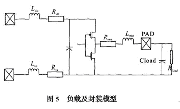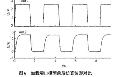 由于ESD 保護(hù)電路以及封裝所帶來的寄生電容和寄生電感對(duì)原有輸出信號(hào)會(huì)有影響,尤其是在高速模擬電路中,頻率越高信號(hào)畸變?cè)絿?yán)重,所以建立合適的仿真模型并進(jìn)行有效的仿真是必須的。信號(hào)一般經(jīng)過驅(qū)動(dòng), ESD 保護(hù),和封裝引線才能傳到芯片外的負(fù)載上,封裝的模型根據(jù)選用的封裝形式和廠家提供的參數(shù)決定。 一般IC 封裝會(huì)給出端口的寄生電容,電阻和電感,其等效模型如圖5所示。 將該模型與前面的ESD 保護(hù)電路(圖3) 串連起來就可以得到端口模型, 可用spice 對(duì)用于USB2.0 的環(huán)境,在480 MHz 頻率下的收發(fā)電路進(jìn)行仿真,其仿真波形如圖6 所示。 輸出端口out1 是不考慮端口模型的影響,480 MHz 時(shí)鐘的輸出較為理想,out2 是加入端口模型后的時(shí)鐘輸出,波形有所畸變,但仍能滿足電路設(shè)計(jì)要求。