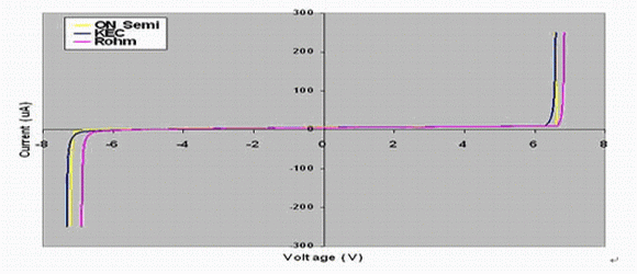 當對以上器件的DC性能進行比較的時候,結(jié)果看起來似乎是相同的(參見圖2所示曲線)。此外,它們都聲稱符合IEC61000-4-2第4級標準,這就意味著它們將都經(jīng)受住高達8kV接觸電壓的ESD沖擊。