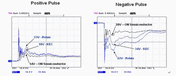 從圖3所示的圖上可見,顯然,與兩個競爭對手的器件(藍色波形)相比較,安森美半導(dǎo)體保護解決方案(黑色波形)可提供更低的ESD脈沖箝位電壓。與KEC的18V和Rohm的23V相比較,安森美的器件將正脈沖箝位在14V。而在負脈沖期間,這三個器件之間箝位電壓的差異更加明顯。安森美、競爭對手2和競爭對手1的器件對負脈沖的箝位電壓分別是20V、34V和42V。在負ESD期間這三種器件之間有明顯的區(qū)別,競爭對手2的器件的箝位電壓比安森美的器件高70%,而競爭對手1的器件的箝位電壓則是安森美器件的兩倍之多。通過競爭對手的保護器件后的剩余負脈沖電壓對那些更容易受到ESD破壞的新IC設(shè)計有潛在的危險。然而,安森美的器件卻能在負脈沖和正脈沖兩個方向上保持低的箝位電壓,從而將遭受正/負ESD脈沖的破壞風險都保持在最低水平。