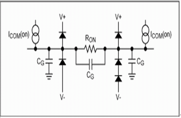 模擬開關內(nèi)的通道元件通常包括一個或更多的MOSFET,同時還包含有寄生鉗位二極管(鉗位至電源電壓),用于ESD保護。圖1顯示了一個閉合的模擬開關的等效電路圖。只要V+和V-存在,并且輸入電壓不超過:電源電壓 + 鉗位二極管的正向偏壓(典型0.6V),二極管就處于反向偏置,沒有電流通過。