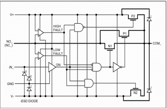 開關內(nèi)部的兩個比較器用于監(jiān)視輸入電壓,它們將輸入電壓與電源電壓V+和V-進行比較。當NO (常開)端或NC (常閉)端上的信號位于V+和V-之間時,開關正常工作。當信號電壓超出電源約150mV時(故障情況),輸出電壓(COM)被限制在電源電壓—保持相同極性且輸入為高阻。這是在故障比較器的控制下實現(xiàn)的,它在故障情況下關閉了N1和P1。故障比較器同時還按照以下規(guī)則控制鉗位FET (N2和P2):如果開關閉合時出現(xiàn)了負極性故障,接通N2連接COM到V-。如果開關閉合時出現(xiàn)了正極性故障,則接通P2連接COM到V+。如果開關開路時出現(xiàn)了故障,則輸出呈現(xiàn)高阻。