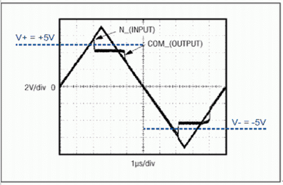 圖6顯示了一個閉合的、具有故障保護的開關在經(jīng)歷兩個方向的輸入故障電壓期間的輸出情況。通常情況下,在輸入電壓比V+ (或V-)高出150mV約200ns后,輸出(COM)就會等于正(或負)電源電壓減去一個FET的電壓降。當輸入電壓返回到電源范圍以內(nèi)后,需要再經(jīng)過一個700ns (典型值)的延遲,輸出方可恢復并跟隨輸入。這個延遲和COM輸出端的電阻和電容有關,而和故障電壓的幅度無關。COM端的電阻和電容越大,恢復時間就越長。