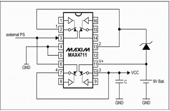 在圖8所示電路中,低電壓故障保護開關在檢測到有外部電源(如墻上適配器)接入時,會切斷內(nèi)部電源(一節(jié)9V電池或兩節(jié)串連的鋰電池)。通常情況下,開關由電池通過13引腳供電。低電壓肖特基二極管阻止非充電電池被外部電源充電。