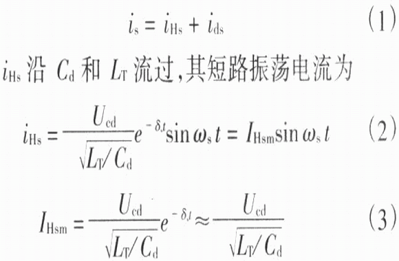 在負載短路時,逆變橋囚侵入干擾信號而產(chǎn)生直通短路,逆變橋輸入電壓突降為零。這時,原來儲藏在濾波電感Ld中的磁能和隔直電容Cd中的電能均分別以短路電流ids和iHs的形式向逆變電路釋放,等效電路圖為圖2(a)所示。橋中IGBT流過的短路電流is為