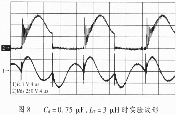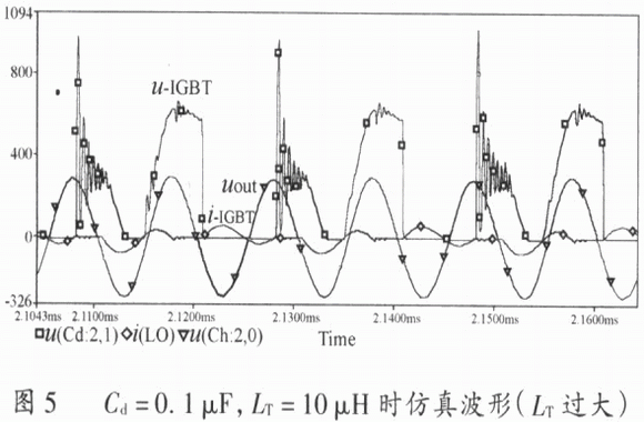 當LT過大時,電路工作時存在以下缺點:LT上的高頻壓降過高,使得輸出電壓降低;管子關斷時承受的正向阻斷電壓升高;內(nèi)槽路諧振頻率減小,IGBT和二極管出現(xiàn)二次導通,如圖5所示。