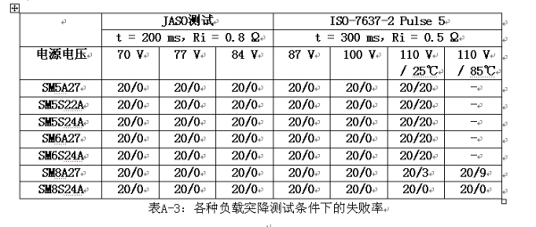 表A-3所示為Vishay的負(fù)載突降TVS在各種負(fù)載突降測(cè)試條件下的失敗率。SM8S24A是ISO-7637-2 Pulse 5測(cè)試最大額定值條件下最強(qiáng)大的器件。