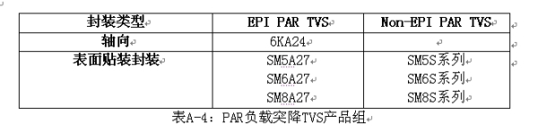 Vishay有兩種類型的汽車電子初級(jí)保護(hù)負(fù)載突降TVS:EPI PARTVS和Non-EPI PARTVS。PAR TVS的產(chǎn)品組列在表A-4當(dāng)中。