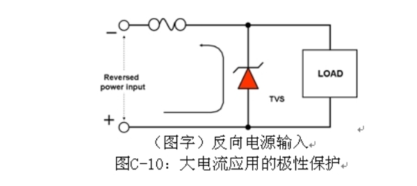 大電流應(yīng)用極性保護(hù)的一種解決方案是使用高正向電流能力的整流器,或者是在電力線中使用沒(méi)有極性保護(hù)二極管的負(fù)載突降TVS,如圖C-10所示。