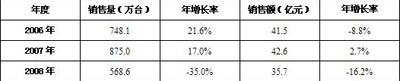 表1 2006-2008年中國MP3/MP4播放機機市場銷售情況