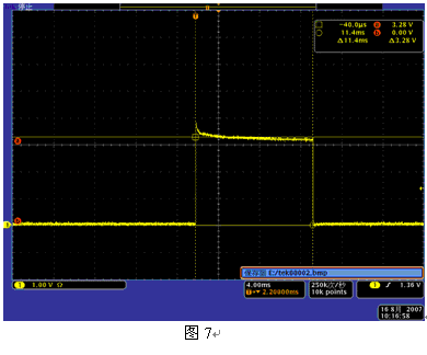 短路情況:多次短路測(cè)試發(fā)現(xiàn)保護(hù)IC(MM3177)能很好的起到短路保護(hù)作用,短路延遲時(shí)間11.4 ms。短路其短路電流情況如圖7(多次測(cè)試發(fā)現(xiàn)每次短路延遲時(shí)間變化微小,取其中較大的一次),此時(shí)測(cè)試到短路電流為16.4A。