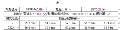 1.測(cè)試S0603-B-5.0A保險(xiǎn)絲在20A熔斷時(shí)間如下表1