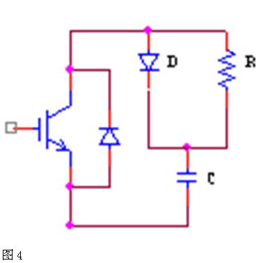 為了使IGBT關(guān)斷過(guò)電壓能得到有效的抑制并減少關(guān)斷損耗,需要給IGBT主電路設(shè)置關(guān)斷緩沖吸收電路。IGBT的關(guān)斷緩沖吸收電路分為充放電型和放電阻止型,從吸收過(guò)電壓的能力上來(lái)說(shuō),充放電型效果較好,所以可在弧焊逆變電源中的IGBT過(guò)壓保護(hù)緩沖電路可采用圖4所示緩沖吸收電路: