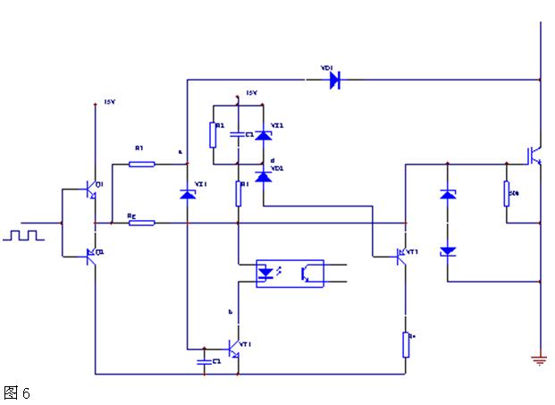 應(yīng)設(shè)計(jì)保護(hù)電路為立即保護(hù)型。即保護(hù)電路動(dòng)作后,切斷供電電源,停止逆變電源工作;最后,對(duì)元器件并沒(méi)有失效,而是由于某種其它原因如負(fù)載突然加大造成的過(guò)流,可嘗試采用一種慢降柵壓的電路來(lái)實(shí)現(xiàn)如圖6: