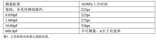 上升和下降時間較慢會給系統帶來一些問題,其中最重要的是時序問題。電路在特定的時間需要穩(wěn)定的“高”態(tài)和“低”態(tài)。隨著各狀態(tài)之間過渡時間的增加,電路有可能檢測到不完整的過渡期,從而將數據誤差引入系統。表1是不同寄生電容ESD抑制器件對數據上升沿時間(10%至90%高電平)所造成的影響比較。