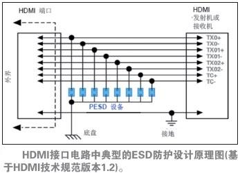 圖6.HDMI接口電路中典型的ESD防護設計原理圖(基于HDMI技術規(guī)范版本1.2)。