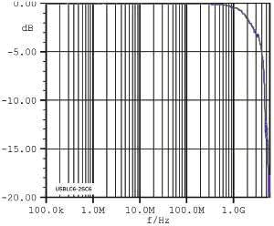 圖3中截止頻率大約為5GHz,遠(yuǎn)離USB480Mb/s收發(fā)器的正常工作頻率,因此,USB收發(fā)器可以安全工作。