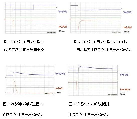 當(dāng)承受圖1中的1、2、3a和3b的脈沖時(shí),該保護(hù)電路的特性如圖6、圖7、圖8、圖9和圖10所示。