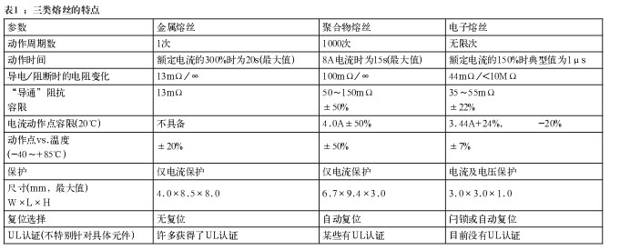 聚合物器件以導(dǎo)電型塑料制成,這些器件在電流(內(nèi)部熱量)達(dá)到預(yù)設(shè)定的電平時(shí)會(huì)改變它們的阻抗。這些器件也經(jīng)常與TVS器件一起使用,就像金屬熔絲那樣。電子熔絲是半導(dǎo)體電路,控制功率開(kāi)關(guān)(通常是功率MOSFET),并按照預(yù)設(shè)的參數(shù)改變其阻抗。表1簡(jiǎn)單比較了這三類(lèi)熔絲。