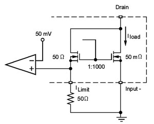 電子熔絲使用SENSEFETTM來(lái)開(kāi)關(guān)電源、限制電流及監(jiān)測(cè)輸出電流。SENSEFET的優(yōu)勢(shì)是僅測(cè)量小部分的負(fù)載電流。沒(méi)有SENSEFET,全部負(fù)載電流將要流經(jīng)感測(cè)電阻,而這將需要大功率、極低阻抗的電阻。與價(jià)格不足1美分的小型片式電阻相比,這些電阻較昂貴。