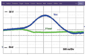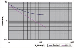 圖2展示NIS5132的一對(duì)曲線。導(dǎo)通較低的曲線時(shí),激活的是短路曲線。一旦電流降低至低于這個(gè)電平,F(xiàn)ET就完全導(dǎo)通(線性區(qū)域),接下來(lái)面對(duì)的就是過(guò)載電平。如果電流達(dá)到過(guò)載電平,F(xiàn)ET的柵驅(qū)動(dòng)將立即減小,而漏極至源極電壓將增加,并會(huì)將工作模式改為短路電平模式。這器件在過(guò)載電平時(shí)不能維持穩(wěn)態(tài)工作。