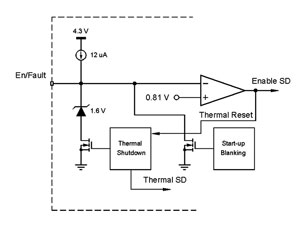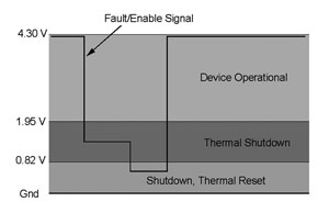 圖5顯示的是這電路的信號(hào)電平,而圖6顯示的是等效原理圖。在正常工作中,內(nèi)部電流源將啟用引腳上拉至4.3V。如果發(fā)生熱故障,由于過(guò)大直流電流、限流或過(guò)壓保護(hù)原因,這器件將關(guān)閉,熱邏輯將把這信號(hào)下拉至1.6V電平。