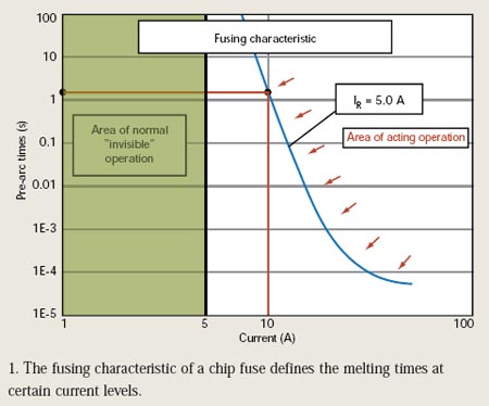 典型情況下,當(dāng)流經(jīng)保險絲的電流是其額定電流的兩倍時,期望保險絲能在1~3秒內(nèi)熔斷。當(dāng)流經(jīng)電流是額定電流的10倍時,熔斷時間應(yīng)小于0.1毫秒。但從相反角度看,為防范保險絲在流過正常浪涌電流時熔斷,浪涌脈動電流的最大I2T應(yīng)大約在保險絲最高額定I2T的一半以內(nèi)。保險絲的熔斷時間與熔斷元件和環(huán)境間的熱阻抗相關(guān),它們?nèi)Q于熔斷元件特性、基板、密封、端連接以及PCB布局。因此,熔斷時間以及所提供的保護(hù)效能,取決于生產(chǎn)技術(shù)和產(chǎn)品設(shè)計。