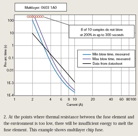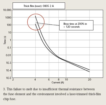 若熔斷元件和環(huán)境間的熱阻抗過低,將沒有足夠能量融化熔斷元件。這將使保險絲不能在120秒內(nèi)切斷相當(dāng)于額定電流兩倍的過載電流。圖2和圖3說明了多層片式保險絲以及激光調(diào)割厚膜芯片保險絲的這種情況。
