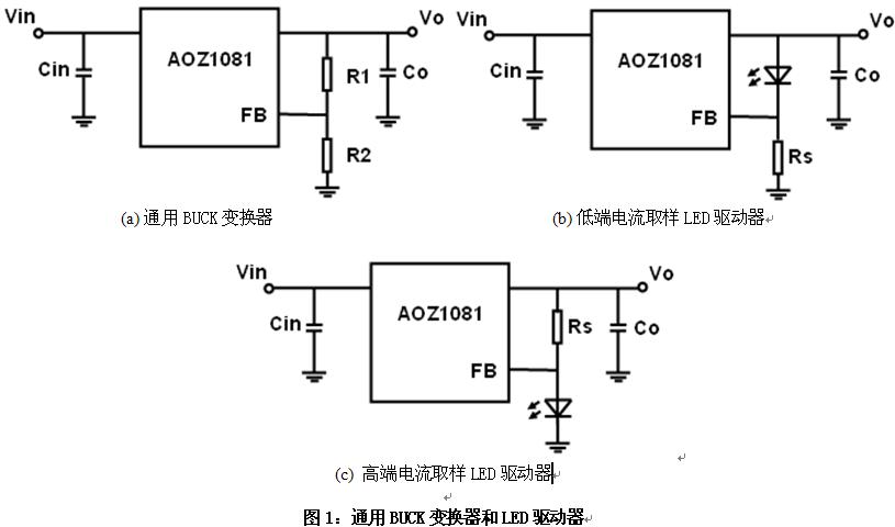 本文將基于AOZ1081來介紹反饋環(huán)的設計,因此先介紹一下AOZ1081的工作特點。AOZ1081是一款降壓型Buck變換器,工作于電流模式,其特點可以讓它配置成LED驅動器,同時也可以作為通用Buck變換器使用。其特點如下: