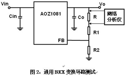 對于通用BUCK降壓型變換器,可以直接在反饋分壓電阻器上部電阻中,直接串接一個100歐姆的電阻R,由R注入測試信號,測量增益裕量和相位裕量,用于決定的系統(tǒng)的穩(wěn)定程度,如圖2所示。注意到,相對于輸出的負載電阻,此回路相當于一個高阻抗回路,因此不影響系統(tǒng)的正常工作。