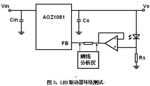 這樣,就必須引入一種隔離的電路,使注入的信號不影響電源系統(tǒng)的正常工作。通常,電壓跟隨器具有阻抗變化,也就是其輸入相當于開路,輸出相當于短路,同時,時還具有緩沖的作用,也就是在信號源和負載之間緩沖,將輸入信號無損耗的輸出。因此,可以使用圖3的電路測量LED驅動器的環(huán)路穩(wěn)定性。