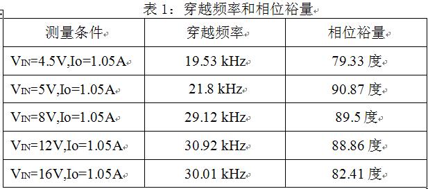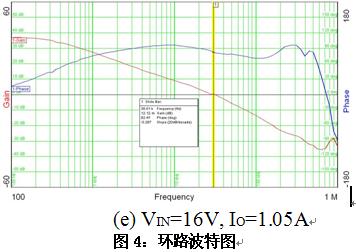 基于AOZ1081設計LED驅動器,輸入電壓4.5 V到16 V,輸出為一個HB LED,;使用Venable的3120測量環(huán)路,Rc=61.9kohm,Cc=820pF,測量波形和結果如圖4和表1所示。
