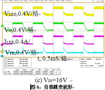 可以用圖5的負載跳變來驗證系統(tǒng)的穩(wěn)定性,MOS驅動信號的頻率為1kHz,負載電流從35mA到350mA跳變,波形如圖6所示