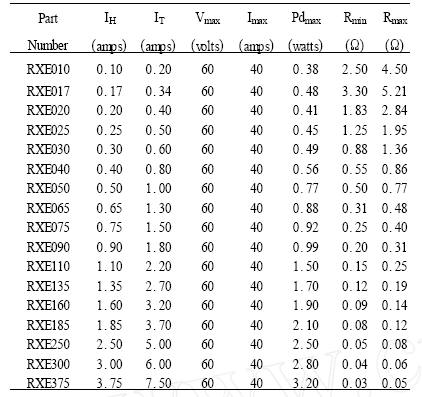 PolySwitch元件有多種系列產(chǎn)品,其產(chǎn)品特性各不相同。以常用的RXE系列元件為例,其20℃時(shí)的電氣特性如表1所示。