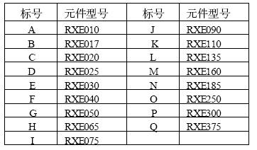 RXE系列PolySwitch元件20℃時(shí)的動(dòng)作保護(hù)特性曲線見(jiàn)圖1。其中橫坐標(biāo)表示故障電流,單位為安培,縱坐標(biāo)表示動(dòng)作時(shí)間,單位為秒。兩個(gè)坐標(biāo)軸均為對(duì)數(shù)坐標(biāo)。圖中每一條曲線對(duì)應(yīng)一個(gè)型號(hào)的元件,構(gòu)成該系列元件的動(dòng)作保護(hù)特性曲線簇。表2為圖1中曲線標(biāo)號(hào)與元件型號(hào)的對(duì)照表。