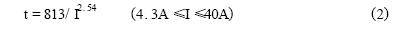 由表1可知,RXE系列PolySwitch元件所能承受的最大電流為40A。該點(diǎn)與臨界點(diǎn)之間為曲線的直線部分。設(shè)動(dòng)作時(shí)間為t(秒),故障電流為I(安),考慮到橫軸、縱軸均為對(duì)數(shù)坐標(biāo),兩者之間應(yīng)具有如下數(shù)學(xué)關(guān)系: