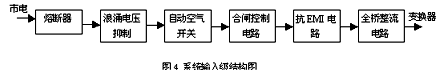 在開關(guān)整流模塊中,輸入級的結(jié)構(gòu)如圖4所示。從圖中可知,此部分主要由熔斷器、浪涌電壓抑制電路、自動空氣開關(guān)、合閘控制電路、抗EMI電路等組成。
